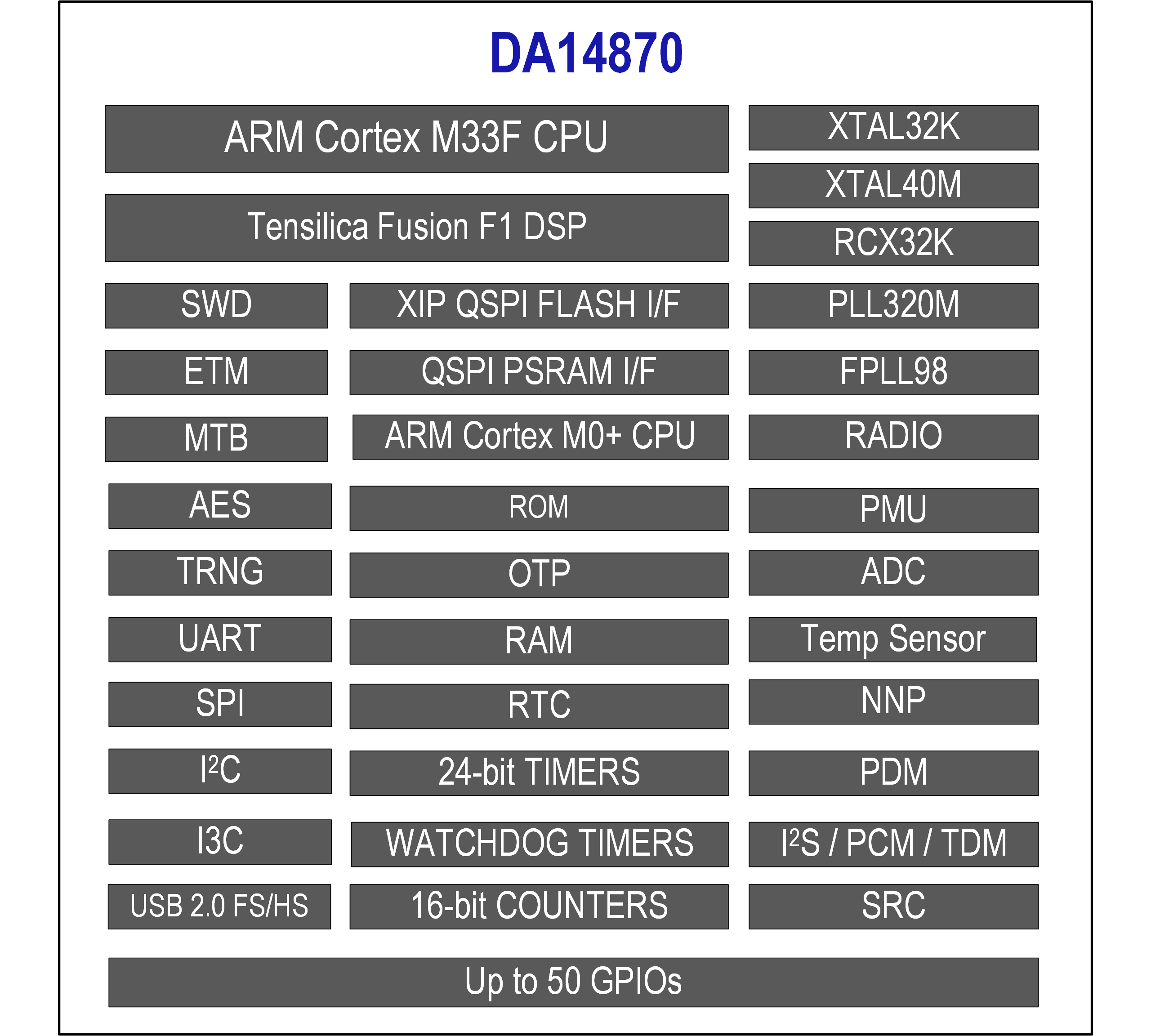 DA14870 Bluetooth® 双模音频 IC 与瑞萨电子智能编解码器及系统 PMIC 相结合,构成了一套灵活的低功耗芯片组,专为高性能便携式蓝牙音频产品而设计。 该芯片组集成了 Arm® Cortex®-M33F 处理器、Tensilica® Fusion F1 音频 DSP、符合 Bluetooth SIG v6.0 标准的核心协议层,并配备丰富的外设和通信接口(其中包含 USB 2.0 HS/FS)。 其专用的低功耗边缘 AI 神经网络处理器 (NNP) 技术支持语音活动检测 (VAD)、热词检测 (HWD)、声音事件检测(例如,玻璃碎裂)以及音频场景检测(例如,音乐),从而赋予设备情境感知能力。