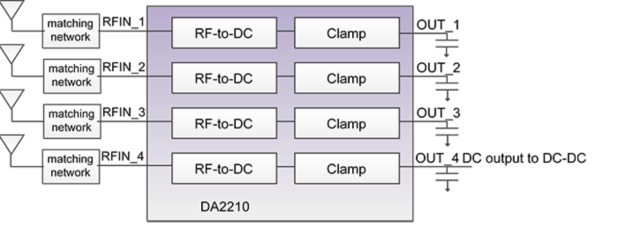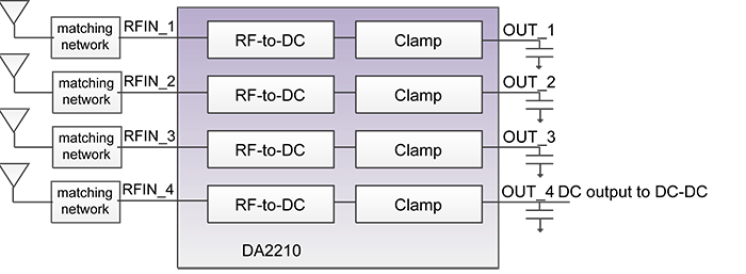 The DA2210 features four RF-to-DC receiver paths, allowing connection of 1 to 4 antennas dependent upon desired power and antenna area available. Antennas can be small enough to fit into in-the-ear hearing aids. Multiple antennas can be used to increase received power for devices with increased area, such as remote controls or battery banks. The DA2210 features external RF input matching for improved flexibility and RF-to-DC conversion efficiency. The device's DC outputs are internally clamped to limit the output voltage to within the range of most DC regulators.