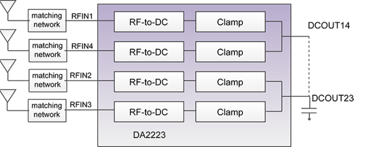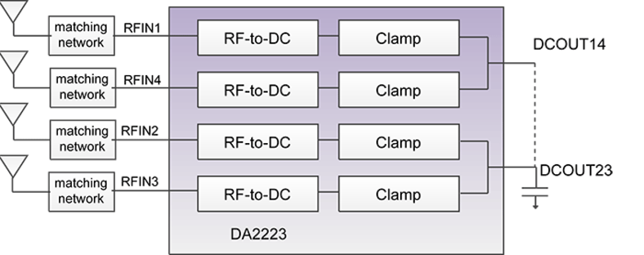 The DA2223 features four RF-to-DC receiver paths, allowing connection of 1 to 4 antennas dependent upon desired power and antenna area available. Antennas can be small enough to fit into in-the-ear hearing aids. Multiple antennas can be used to increase received power for devices with increased area, such as remote controls or battery banks. The DA2223 features external RF input matching for improved flexibility and RF-to-DC conversion efficiency. The device's DC outputs are internally clamped to limit the output voltage to within the range of most DC regulators. With a form factor smaller than the DA2210 wireless power receiver, the DA2223 is ideal for use in very small electronic devices, thus offering further flexibility in integration.