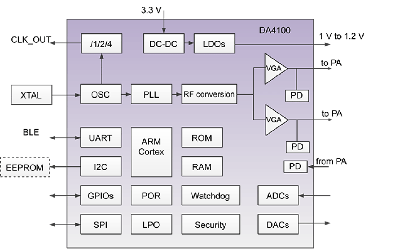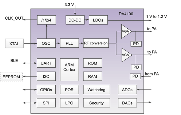 - The device only requires an external crystal and power amplifier and operates directly from a 3.3V power supply.
