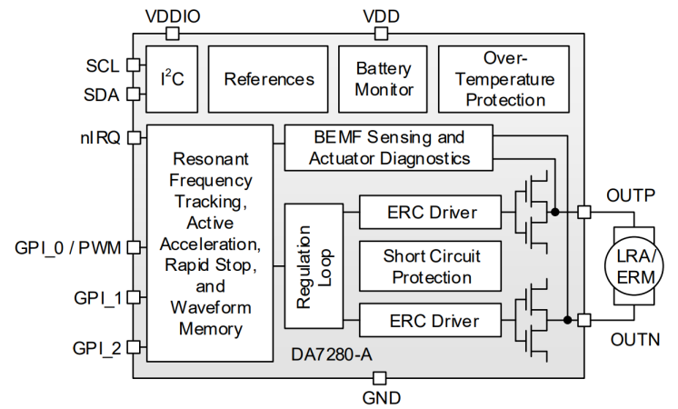 The DA7280-A high-definition (HD) haptic driver combines custom drive sequences, on- and off-resonance, at up to 1kHz. The DA7280-A can drive both ERM and LRA (narrow and wideband) actuators and track resonance up to 300Hz to drive the most complex click/vibration touch effects in a wide range of applications.