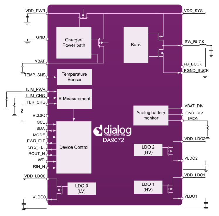 DA9072 包括动态电源路径管理,可自动平衡系统和电池之间输送的电流。 电池监控器适用于小型电池应用,便于按需监控外部 MCU 的 ADC 的电池电压和放电电流,以支持软件电量监测。