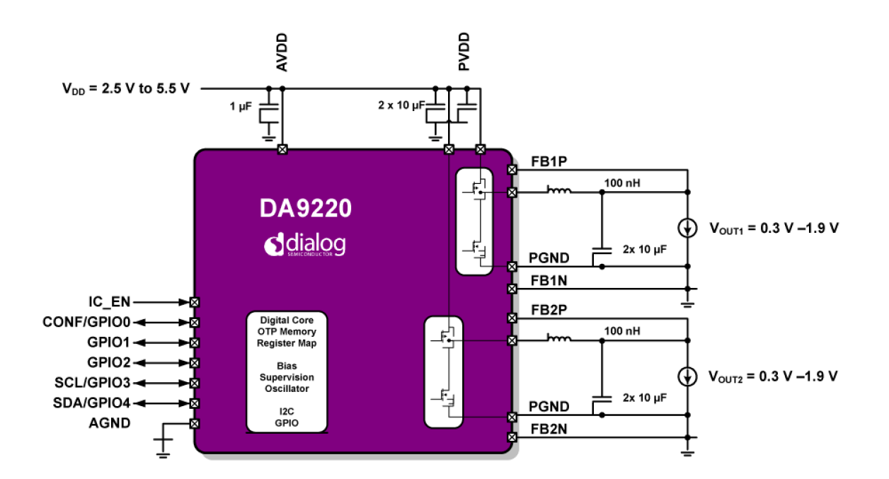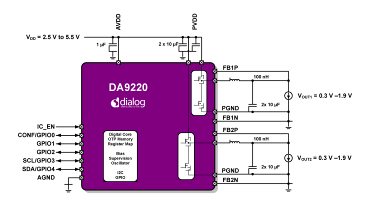 DA9220 集成了两个单相降压转换器,每相需要一个小型外部 0.10μH 电感器。 该器件能够在 0.3V 至 1.9V 输出电压范围内提供高达 3A 的输出电流。 2.5V 至 5.5V 输入电压范围适用于各种低压系统,包括但不限于所有锂离子电池供电的应用。