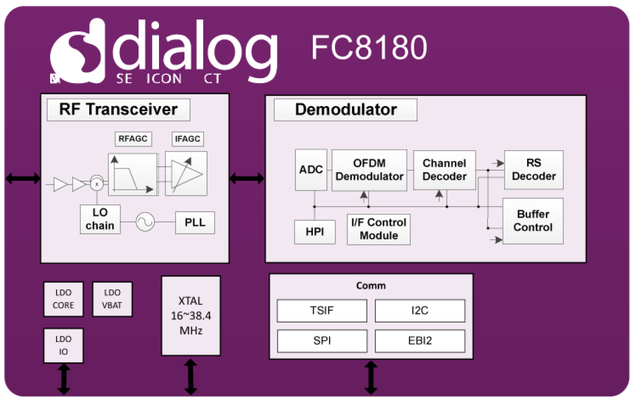 The FC8180 is a highly integrated RF and demodulator chip for receiving digital broadcast such as Integrated Services Digital Broadcasting Terrestrial (ISDB-T) 1-Seg. FC8180 is a single-die implementation of FCI proprietary RF and demodulator with outstanding in-door and mobility performances. It provides good sensitivity and immunity to interference with low power consumption mostly suitable for mobile phone and many other portable devices.