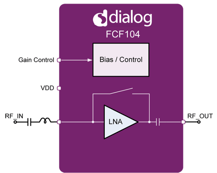 The FCF104 is a front-end low noise amplifier (LNA) for LTE receiver applications that covers the frequency range from 716MHz to 960MHz. The LNA has a high gain mode and bypass gain mode. It operates from 1.5V to 3.3V supply voltage. In the high gain mode, the LNA provides 15dB gain, 0.7dB NF (noise figure), 4.4dBm in-band IIP3 (input third order intercept point) at a current consumption of 5.4mA. In the bypass gain mode, the LNA provides -2dB gain, 2dB NF, 26.7dBm IIP3.