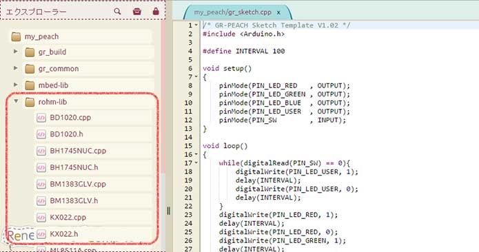 First, create a project for GR-PEACH on the web compiler. Then, upload the zip into the root of your project. For more information on how to create a project using the web compiler, refer to the Sketch on Web Compiler project.