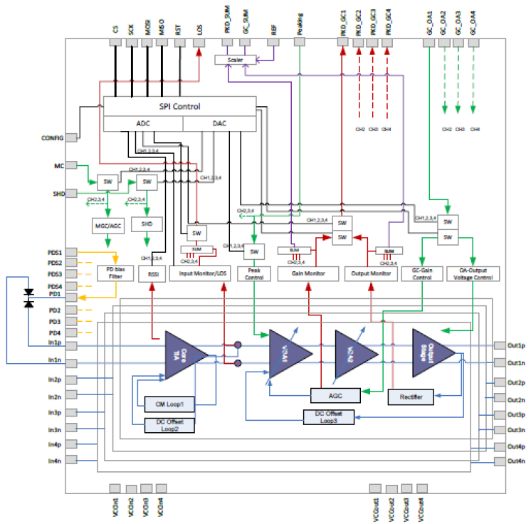 The GX36420 is a 64Gbps linear quad TIA chip that integrates four lanes of TIAs for XI, XQ, YI, and YQ channels, as well as digital interface circuitry for DC controls on a single die for 400G/600G coherent applications. The TIA electrical characteristics, functions, and physical dimensions are designed for small-form factor integrated optical module such as CFP2 and CFP4.