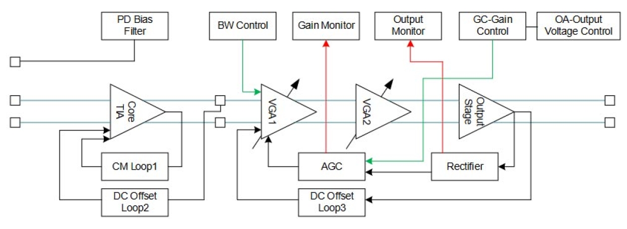 The GX39221 integrates two TIA signal paths for "I" and "Q" channels. The high-performance, low power, and compact design of the GX39221 also enables a small form factor (SFF) integrated optical module such as CFP2 and CFP4.