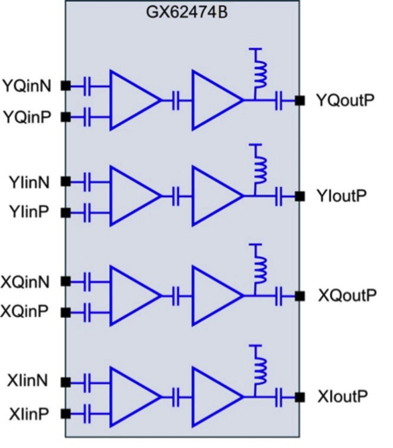 The GX62474B is a high-performance parallel low Vpi limiting Mach-Zender Modulator (MZM) driver designed for 100G DP-QPSK long-haul optical transmitters. The GX62474B is a small form factor (SFF) with differential inputs and single ended outputs. The GX62474B is a surface mount device (SMD) packaged solution consisting of 4 x 32Gb/s broadband amplifiers, each capable of driving a limiting output voltage of 7.0Vpp suitable for multilevel modulation applications.