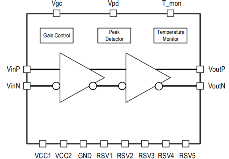 The GX72170 is a broad band and ultralow power SiGe single-channel amplifier die, and integrates a linear pre-amplifier and a post-amplifier with AC-coupled differential input and differential output interfaces. The device can drive a linear output voltage of 3.0Vppd with differential characteristic impedance of around 50Ω.