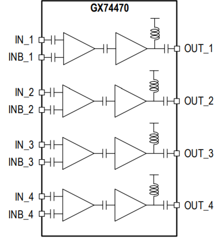 The GX74470 is a small form factor (SFF) packaged surface mount device (SMD) with differential inputs and single-ended outputs consisting of 4 x 46Gbps broadband amplifier channels, each capable of driving a linear output voltage of 4.5Vpp, suitable for multi-level modulation applications.