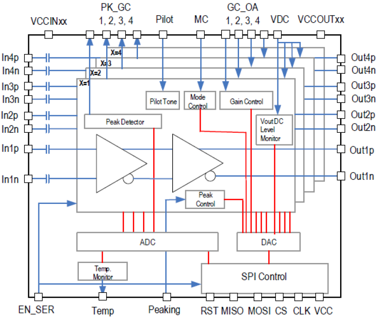 The GX76472 integrated quad lanes of driver with SPI circuitry for DC controls on a single die. Each channel of driver has 100Ω differential AC-coupled input and 100Ω differential interface with a back terminated output stage to allow external AC-coupled interface with optical modulator, and linear output voltage of 4.0Vppd suitable for LiNbO3 multi-level modulations.