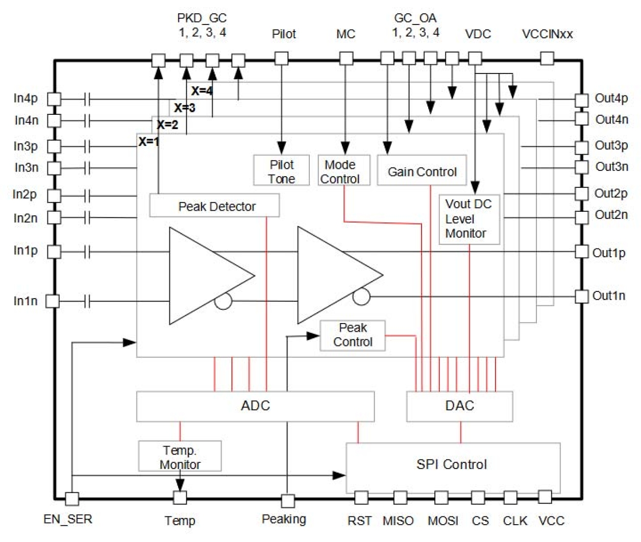 - Analog control for gain and output voltage setting, and analog monitor for peak detector and gain control monitor