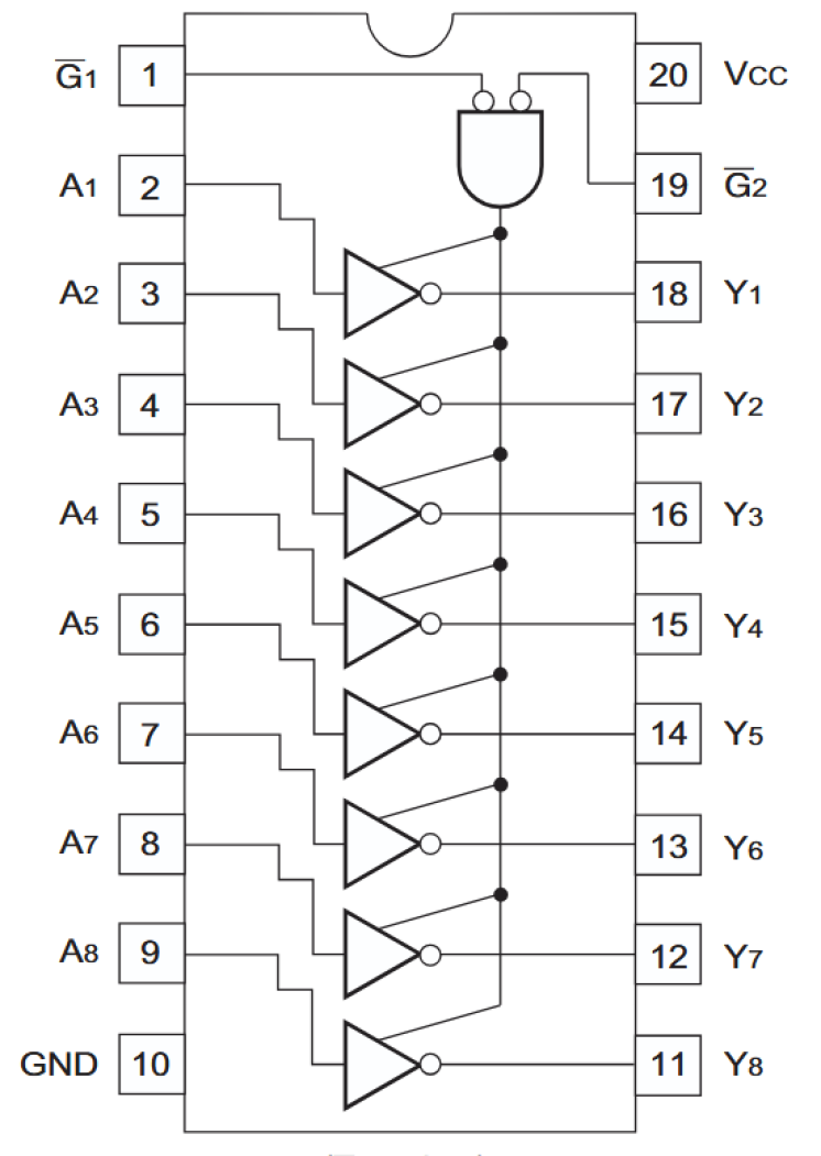 The HD74HC540 is an inverting buffer and the HD74HC541 is a non-inverting buffer. The 3-state control gate operates as a two-input NOR such that if either G1 or G2 are high, all eight outputs are in the high-impedance state.
