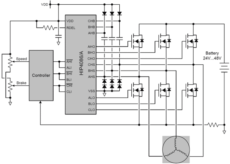 HIP4086 和 HIP4086A(亦称 HIP4086/A)是三相 N 沟道 MOSFET 驱动器。 这两款器件均专门用于 PWM 电机控制。 这些驱动器具有灵活的输入协议,用于驱动所有可能的开关组合。 对于开关磁阻应用,用户甚至可以覆盖击穿保护功能。 HIP4086/A 的可编程死区时间范围较宽(0.5μs 至 4.5μs),因此非常适合电机驱动器通常使用的低频(最高 100kHz)。 HIP4086 和 HIP4086A 的唯一区别是 HIP4086A 禁用了内置电荷泵。 该功能非常有利于需要安静 EMI 性能的应用(电荷泵工作频率为 10MHz)。 HIP4086 的优势在于内置的电荷泵可以无限延长高端驱动器的导通时间。 为确保高端驱动器启动电容器在开启前充满电,在首次应用 VDD 时会激活一个可编程启动刷新脉冲。 激活时,刷新脉冲会打开所有三个低端桥式场效应晶体管,同时关闭三个高端桥式场效应晶体管,以便为高端启动电容器充电。 刷新脉冲清除后,开始正常运行。 HIP4086/A 的另一个实用功能是可编程欠压设定点。 设定点范围从 6.6V 至 8.5V 不等。