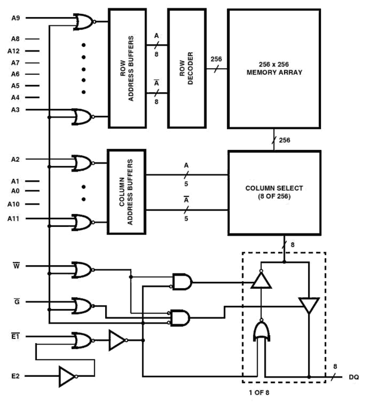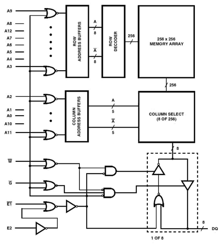 The HM-65642 is a CMOS 8192 x 8-bit Static Random Access Memory. The pinout is the JEDEC 28 pin, 8-bit wide standard, which allows easy memory board layouts which accommodate a variety of industry standard ROM, PROM, EPROM, EEPROM and RAMs. The HM-65642 is ideally suited for use in microprocessor based systems. In particular, interfacing with the Intersil 80C86 and 80C88 microprocessors is simplified by the convenient output enable (G) input. The HM-65642 is a full CMOS RAM which utilizes an array of six transistor (6T) memory cells for the most stable and lowest possible standby supply current over the full military temperature range.
