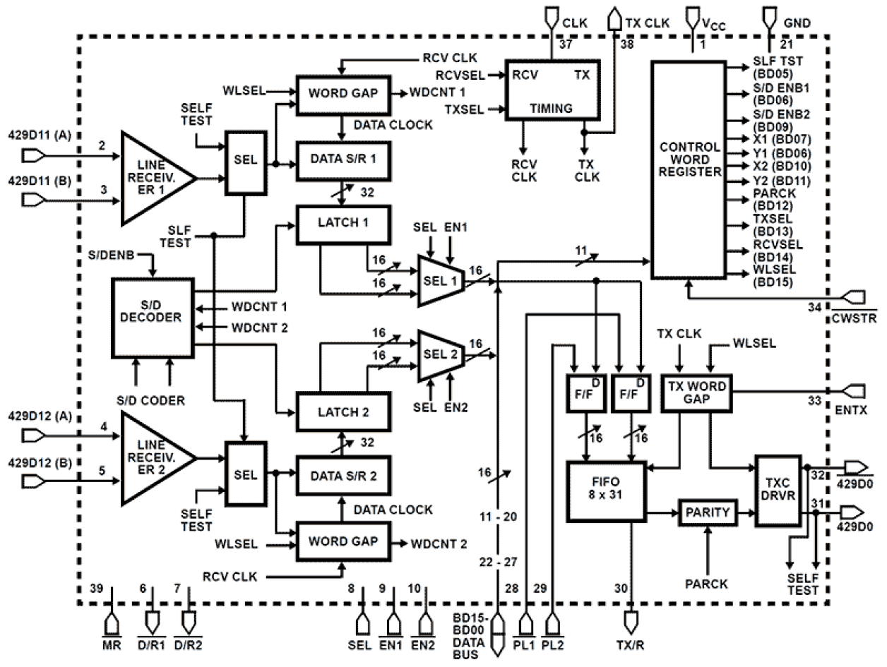 The HS-3282 is a high performance CMOS bus interface circuit that is intended to meet the requirements of ARINC Specification 429, and similar encoded, time multiplexed serial data protocols. This device is intended to be used with the HS-3182, a monolithic Dl bipolar differential line driver designed to meet the specifications of ARINC 429. The ARINC 429 bus interface circuit consists of two (2) receivers and a transmitter operating independently as shown in Figure 1. The two receivers operate at a frequency that is ten (10) times the receiver data rate, which can be the same or different from the transmitter data rate. Although the two receivers operate at the same frequency, they are functionally independent and each receives serial data asynchronously. The transmitter section of the ARINC bus interface circuit consists mainly of a First-In First-Out (FIFO) memory and timing circuit. The FIFO memory is used to hold up to eight (8) ARINC data words for transmission serially. The timing circuit is used to correctly separate each ARINC word as required by ARINC Specification 429. Even though ARINC Specification 429 specifies a 32-bit word, including parity, the HS-3282 can be programmed to also operate with a word length of 25 bits. The incoming receiver data word parity is checked, and a parity status is stored in the receiver latch and output on Pin BD08 during the 1st word. [A logic 0 indicates that an odd number of logic 1 s were received and stored; a logic 1 indicates that an even number of logic 1s were received and stored]. In the transmitter the parity generator will generate either odd or even parity depending upon the status of PARCK control signal. A logic 0 on BD12 will cause odd parity to be used in the output data stream. Versatility is provided in both the transmitter and receiver by the external clock input which allows the bus interface circuit to operate at data rates from 0 to 100 kilobits. The external clock must be ten (10) times the data rate to insure no data ambiguity. The ARINC bus interface circuit is fully guaranteed to support the data rates of ARINC specification 429 over both the voltage (±5%) and full military temperature range. It interfaces with UL, CMOS or NMOS support circuitry, and uses the standard 5-volt VCC supply.