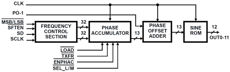 The Intersil HSP45102 is Numerically Controlled Oscillator (NCO12) with 32-bit frequency resolution and 12-bit output. With over 69dB of spurious free dynamic range and worst case frequency resolution of 0. 009Hz, the NCO12 provides significant accuracy for frequency synthesis solutions at a competitive price. The frequency to be generated is selected from two frequency control words. A single control pin selects which word is used to determine the output frequency. Switching from one frequency to another occurs in one clock cycle, with a 6 clock pipeline delay from the time that the new control word is loaded until t4-he new frequency appears on the output. Two pins, P0-1, are provided for phase modulation. They are encoded and added to the top two bits of the phase accumulator to offset the phase in 90° increments. The 13-bit output of the Phase Offset Adder is mapped to the sine wave amplitude via the Sine ROM. The output data format is offset binary to simplify interfacing to D/A converters. Spurious frequency components in the output sinusoid are less than -69dBc. The NCO12 has applications as a Direct Digital Synthesizer and modulator in low cost digital radios, satellite terminals, and function generators.