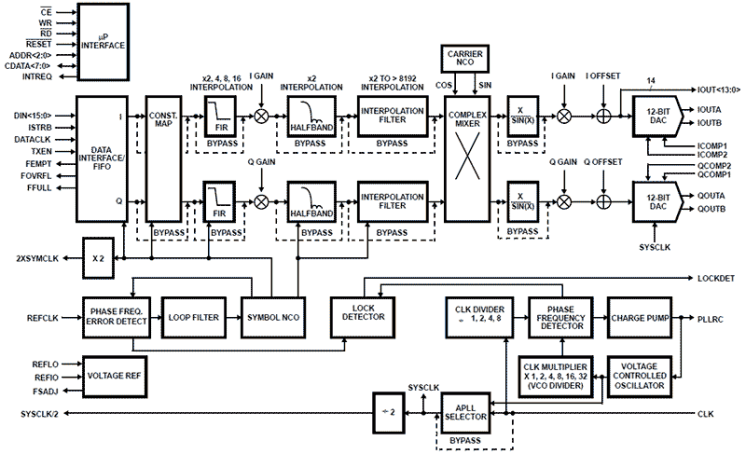 - Dual 12-bit D/A Processing Capable of >50dB SFDR