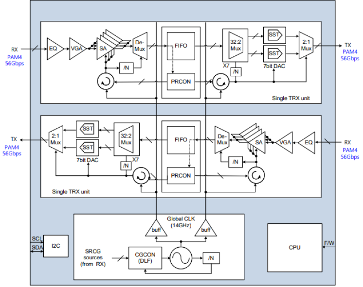 - Single chip 56Gbps CDR/Retimer with transmit and receiver