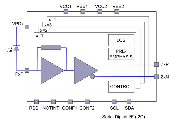 The HXR32400 Transimpedance Amplifier with Limiting Output stage, 4th generation device is a lower power member of the family of Optical Receiver Transmitter Array (ORTA) products targeted at the 28Gbps parallel optical links market. Together with a PIN detector array or discrete detectors, high-capacity, high-availability optical 100GBase-CLR4 links can be designed for telecom and datacom applications. The SiGe device integrates the transimpedance preamplifier, the limiting post-amplifier and a versatile CML output stage for four optical channels.