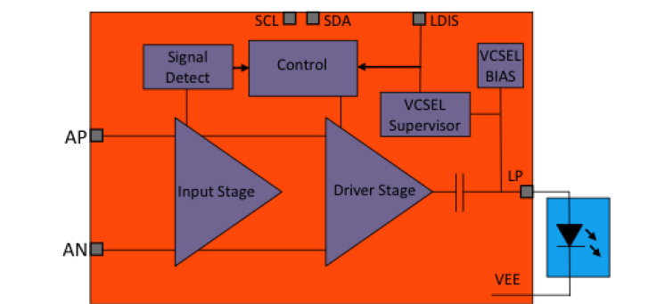 The HXT4101A VCSEL driver is a key component for compact, high-performance, low-power optical modules. In conjunction with the VCSEL, the chip handles the complete digital-to-optical conversion, including CML input, laser driver, drive control, and supervision. The HXT4101A can be used in standalone mode (no microcontroller need), or in an I2C-controlled mode. The I2C interface and the embedded monitoring circuits enable fully programmable OSAs with co-packaged VCSEL and driver, for example low-power SFP+ modules using Smart TO-cans®. Both operational modes require a small number of additional components resulting in low cost, compact, high yield assemblies.