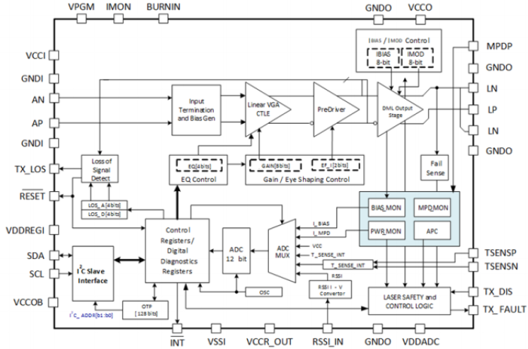 The HXT44120 also integrates a number of functions required for Automatic Power Control (APC), as well as internal and module temperature measurements and reporting. With an additional RSSI input, one can directly measure the module receive optical power and report it.