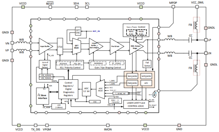 The HXT44121-1 integrates several functions required for Automatic Power Control (APC), as well as internal and module temperature measurements and reporting. With an additional RSSI input, the user can directly measure the module receive optical power and report it. The device is designed as an AC-coupled packaged driver to work with TO-CAN or TOSA type of DML lasers.