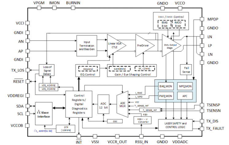 The HXT44420 also integrates several functions required for Automatic Power Control (APC), as well as internal and module temperature measurements and reporting. With an additional RSSI input, one can directly measure the module receive optical power and report it.