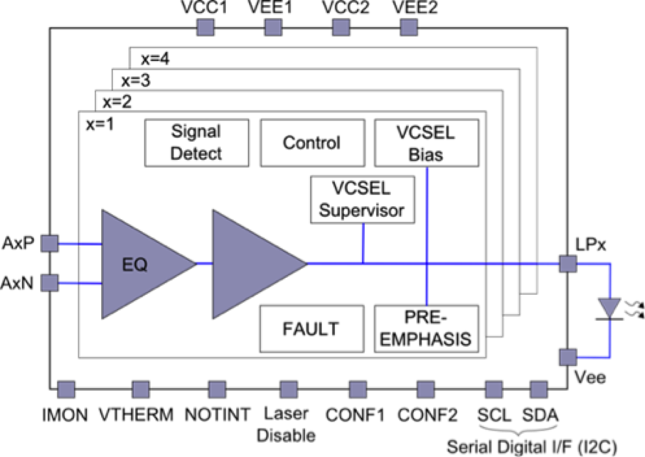 The HXT5004A VCSEL driver array is a key component for compact, robust, low-power optical transmitter modules. In conjunction with the VCSEL array, the chip handles the complete digital-to-optical conversion, including CML input, laser driver, drive control, and supervision. Standard silicon technology and a small number of additional components allow for cost-effective and compact assemblies.