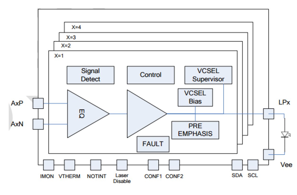 - Low power consumption of 150mW per channel while delivering 5mA average and 5mA modulation current