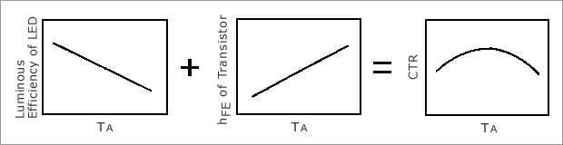 Whereas the LED luminous efficiency has a negative temperature coefficient, hFE of the transistor has a positive temperature coefficient. Therefore, the CTR dependency on the temperature is a combination of these two parameters.