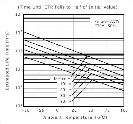 Figure 5 shows an example of the estimated life of a photocoupler according to differences in the LED input current (IF) and the ambient temperature (TA).
