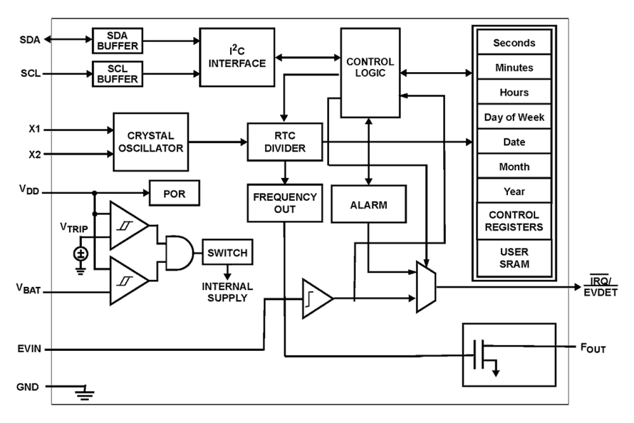 The ISL1221 device is a low power real time clock with Event Detect and Time Stamp function, timing and crystal compensation, clock/calendar, power fail indicator, periodic or polled alarm, intelligent battery backup switching with separate FOUT output and 2 Bytes of battery-backed user SRAM. The oscillator uses an external, low-cost 32. 768kHz crystal. The real time clock tracks time with separate registers for hours, minutes, and seconds. The device has calendar registers for date, month, year and day of the week. The calendar is accurate through 2099, with automatic leap year correction.