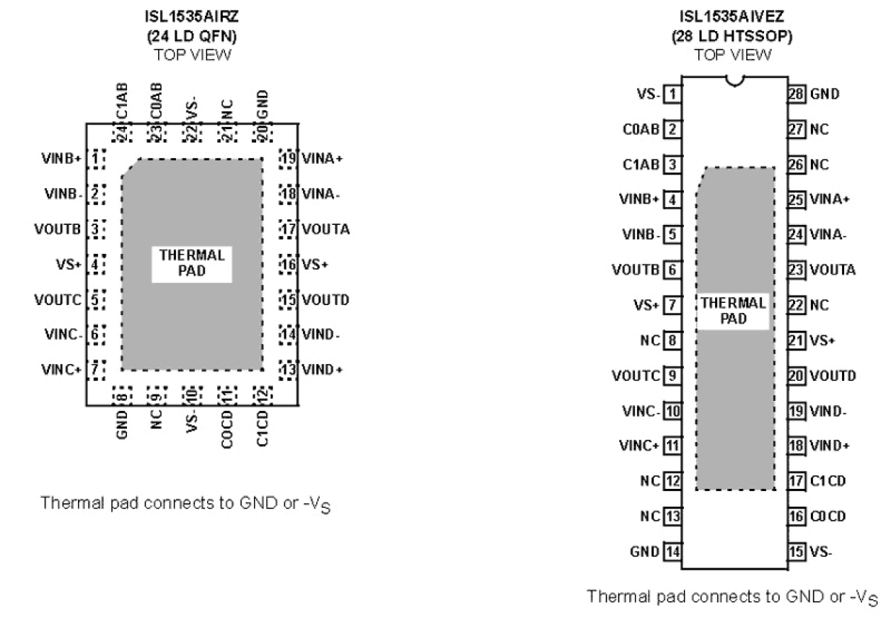 The ISL1535A is a very low power dual channel differentiated amplifier designed for central office line driving for DMT ADSL2+ solutions. This device features a high drive capability of 600mA while consuming 7. 5mA of supply current per amplifier from ±12V supplies. This driver achieves a typical distortion of less than -75dBc, at 1MHz into a 50Ω load. The ISL1535A is available in a 28 Ld HTSSOP package and a 24 Ld QFN package. This device is specified for operation over the full -40°C to +85°C temperature range. The ISL1535A has two control pins, C0 and C1, per channel. With the selection of C0 and C1, the device can be set into full-IS power, 3/4-IS power, 1/2-IS power, and power-down disable modes. The ISL1535A maintains excellent distortion and load driving capabilities even in the lowest power settings. The ISL1535A has extended bandwidth, low THD and high slew rate for ADSL2+ applications.