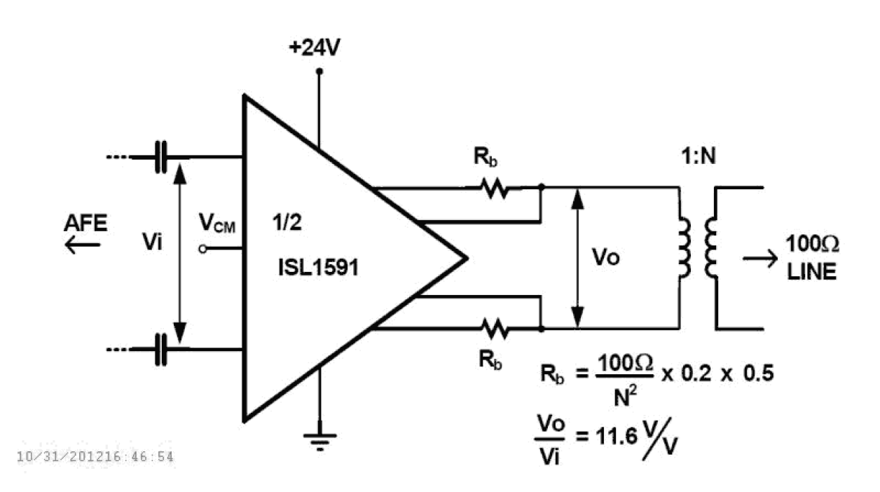 The ISL1591 provides 4 internal wideband op amps intended to be used as two pairs of fixed gain differential line drivers. The ISL1591s high bandwidth, and ultra low distortion enables the support of VDSL2 8b, 17a, and 30a in central office modem applications. This highly versatile line driver allows for operation from +14V to +24V nominal power supplies, while delivering exceptional MTPR distortion performance. Using a single +24V supply, the ISL1591 MBPR distortion is below -62dBc in VDSL2 8b, -63dBc in VDSL2 17a, and -60dBc in VDSL2 30a profiles. Using a single +14V supply, ISL1591 supports 14. 5dBm VDSL2 17a and 30a profiles at only a power consumption of 425mW. This capability is ideal for short loop, high bit rate VDSL2 applications where 14. 5dBm transmit power is all that is required. For full power VDSL2 8b profile with 20dBm of transmit power, the line driver will require +24V single supply. Each of the 4 internal op amps is a wideband current feedback amplifier offering very high slew rate intrinsic to that design using low quiescent current levels. Each of the two pair of amplifiers (ports) can also be power optimized to the application using two external quiescent control logic pins. Full power is nominally 14mA/port with options of medium power cutback to 9. 7mA/port, a low power condition at 7. 4mA/port, and an off state at 0. 5mA/port. High power push/pull line driver applications are best supported using a low headroom, high output current device. On +24V supplies, the ISL1591 offers a 1. 6V headroom with >360mA peak output current. Driving differentially, this gives >42. 4VP-P swing to as low as 58Ω differential load. The four amplifiers in ISL1591 are intended to be used as differential pairs and not as individual amplifiers.