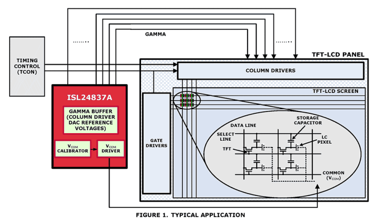The ISL24837A contains a programmable 10-bit, 8-channel gamma DAC generator, a programmable 10-bit, 4-channel level shifter reference generator with external gain control, a trimmed bandgap voltage reference, and a digitally-controlled VCOM calibrator.