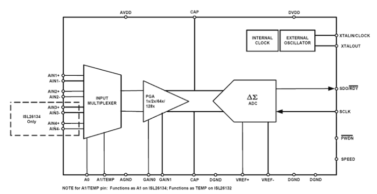 The ISL26132 and ISL26134 are complete analog front ends for high resolution measurement applications. These 24-bit Delta-Sigma Analog-to-Digital Converters include a very low-noise amplifier and are available as either two or four differential multiplexer inputs. The devices offer the same pinout as the ADS1232 and ADS1234 devices and are functionally compatible with these devices. The ISL26132 and ISL26134 offer improved noise performance at 10Sps and 80Sps conversion rates. The on-chip low-noise programmable-gain amplifier provides gains of 1x/2x/64x/128x. The 128x gain setting provides an input range of ±9. 766mVFS when using a 2. 5V reference. The high input impedance allows direct connection of sensors, such as load cell bridges to ensure the specified measurement accuracy without additional circuitry. The inputs accept signals 100mV outside the supply rails when the device is set for unity gain. The Delta-Sigma ADC features a third order modulator providing up to 21. 6-bit noise-free performance. The device can be operated from an external clock source, crystal (4. 9152MHz typical), or the on-chip oscillator. The two channel ISL26132 is available in a 24 Ld TSSOP package and the four channel ISL26134 is available in a 28 Ld TSSOP package. Both are specified for operation over the automotive temperature range (-40°C to +105°C).