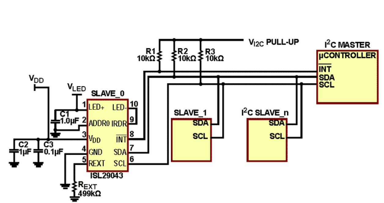 The ISL29043 is an integrated ambient and infrared light-to-digital converter with a built-in IR LED and I2C interface (SMBus compatible). This device uses two independent ADCs for concurrently measuring ambient light and proximity in parallel. The flexible interrupt scheme is designed for minimal microcontroller utilization. For ambient light sensor (ALS) data conversions, an ADC converts the photodiode current (with a light sensitivity range up to 2000 lux) in 100ms per sample. The ADC rejects 50Hz/60Hz flicker noise caused by artificial light sources. For proximity sensor (Prox) data conversions, the built-in driver turns on an internal infrared LED and the proximity sensor ADC converts the reflected IR intensity to digital. This ADC rejects ambient IR noise (such as sunlight) and has a 540µs conversion time. The ISL29043 provides the low power operation of ALS and proximity sensing with a typical 136µA normal operation current (110µA for sensors and internal circuitry, ~28µA for LED) with 220mA current pulses for a net 100µs, repeating every 800ms (or under). The ISL29043 uses both a hardware pin and software bits to indicate an interrupt event has occurred. An ALS interrupt is defined as a measurement that is outside a set window. A proximity interrupt is defined as a measurement over a threshold limit. The user may also require that both ALS/Prox interrupts occur at once, up to 16 times in a row before activating the interrupt pin. The ISL29043 is designed to operate from 2.25V to 3.63V over the -40 °C to +85 °C ambient temperature range. It is packaged in a clear, lead-free 10 Ld ODFN package.