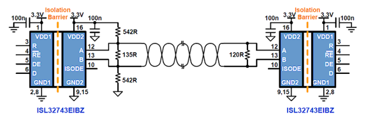 The ISL32743E is a galvanically isolated high-speed differential bus transceiver, designed for bidirectional data communication on balanced transmission lines. The device uses Giant Magnetoresistance (GMR) as its isolation technology. The part is available in a 16 Ld SOICW package providing a true 8mm creepage distance. A unique ceramic/polymer composite barrier provides excellent isolation and 44, 000 years of barrier life. The device is compatible with 3V and 5V input supplies, allowing an interface to standard microcontrollers without additional level shifting. Current limiting and thermal shutdown features protect against output short circuits and bus contention that may cause excessive power dissipation. Receiver inputs are a full fail-safe design, ensuring a logic high R-output if A/B are floating or shorted.