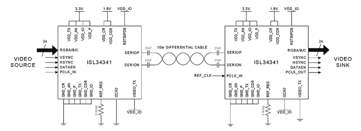 The ISL34341 is a serializer/deserializer of LVCMOS parallel video data. The video data presented to the serializer on the parallel LVCMOS bus is serialized into a high-speed differential signal. This differential signal is converted back to parallel video at the remote end by the deserializer. It also transports auxiliary data bidirectionally over the same link during the video vertical retrace interval. I2C bus mastering allows the placement of external slave devices on the remote side of the link. An I2C controller can be placed on either side of the link allowing bidirectional I2C communication through the link to the external devices on the other side. Both chips can be fully configured from a single controller or independently by local controllers.
