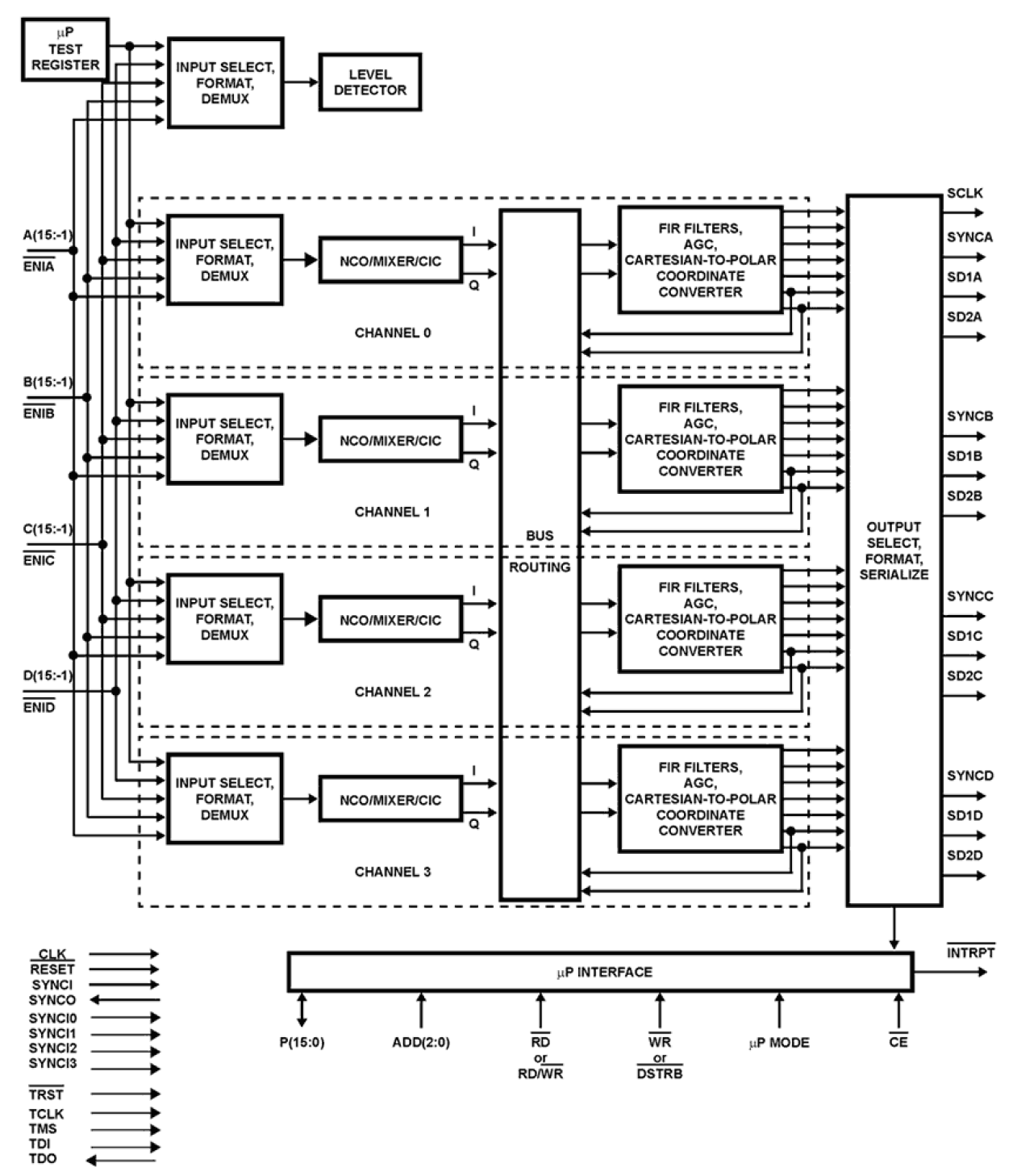 The ISL5216 Quad Programmable Digital Downconverter (QPDC) is designed for high dynamic range applications such as cellular basestations where multiple channel processing is required in a small physical space. The QPDC combines into a single package a set of four channels which include: digital mixers, a quadrature carrier NCO, digital filters, a resampling filter, a cartesian to polar coordinate converter, and an automatic gain control (AGC) loop. The ISL5216 accepts four channels of 16-bit fixed or up to 14-bit mantissa/3-bit exponent floating point real or complex digitized IF samples which are mixed with local quadrature sinusoids. Each channel carrier NCO frequency is set independently by the microprocessor. The output of the mixers is filtered with CIC and FIR filters, with a variety of decimation options. Gain adjustment is provided on the filtered signal. The digital AGC provides a gain adjust range of up to 96dB with programmable thresholds and slew rates. A cartesian to polar coordinate converter provides magnitude and phase outputs. A frequency discriminator is also provided to allow FM demodulation. Selectable outputs include I samples, Q samples, magnitude, phase, frequency, and AGC gain. The output resolution is selectable from a 4-bit fixed point to a 32-bit floating point. Output bandwidths in excess of 1MHz are achievable using a single channel. Wider bandwidths are available by cascading or polyphasing multiple channels.