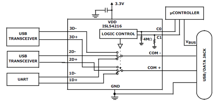The Intersil ISL54216 is a single supply dual SP3T analog switch that operates from a single supply in the range of 2. 7V to 4. 6V. It was designed to multiplex between three different differential data sources, allowing the multiplexing of USB 2. 0 high speed and/or UART data signals through a common headphone connector in Personal Media Players and other portable battery powered devices. The switch channels have very low ON capacitance and high bandwidth to pass USB high speed signals (480Mbps) with minimal edge and phase distortion and can swing rail-to-rail to pass UART and full-speed USB signals. The ISL54216 is available in a tiny 12 Ld 2. 2mmx1. 4mm ultra-thin QFN and 12 Ld 3mmx3mm TQFN packages. It operates over a temperature range of -40°C to +85°C.