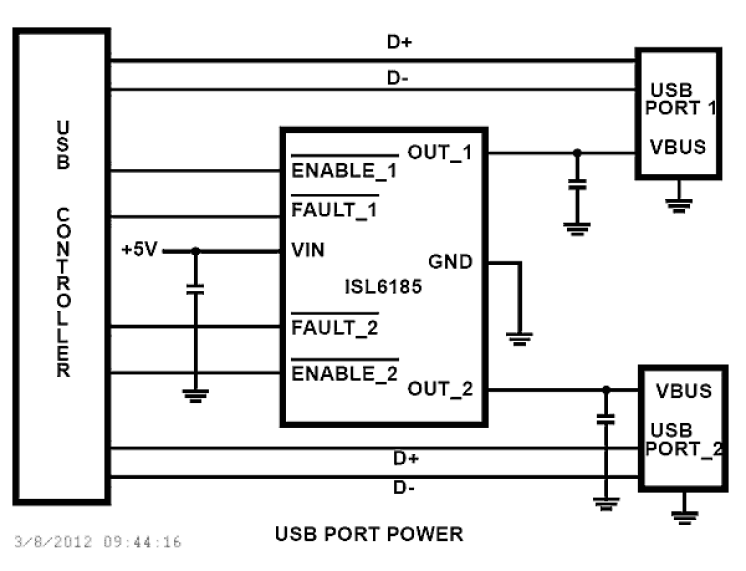 The ISL6185 USB power controller family provides fully independent overcurrent (OC) fault protection for two or more USB ports. This product family consists of sixteen individual functional product variants and three package options. It is operation rated for a nominal +2. 5V to +5V range and is specified over the full commercial and industrial temperature ranges. Each ISL6185 type incorporates in a single package two 71mΩ P-channel MOSFET power switches for power control. Each features internal current monitoring, accurate current limiting, and current limited delay to turn-off, for system supply protection along with control and communication I/O. The ISL6185 family offers product variants with specified continuous output current levels of 0. 6A, 1. 1A, 1. 5A or 1. 8A; enable active high or low inputs; and latch off or automatic retry after overcurrent turn-off, making these devices well suited for many low-power applications. This family of ICs is offered in an industry-standard SOIC pinout and also in the 70% smaller 3x3 DFN packages providing similar or enhanced performance in the smallest possible package.