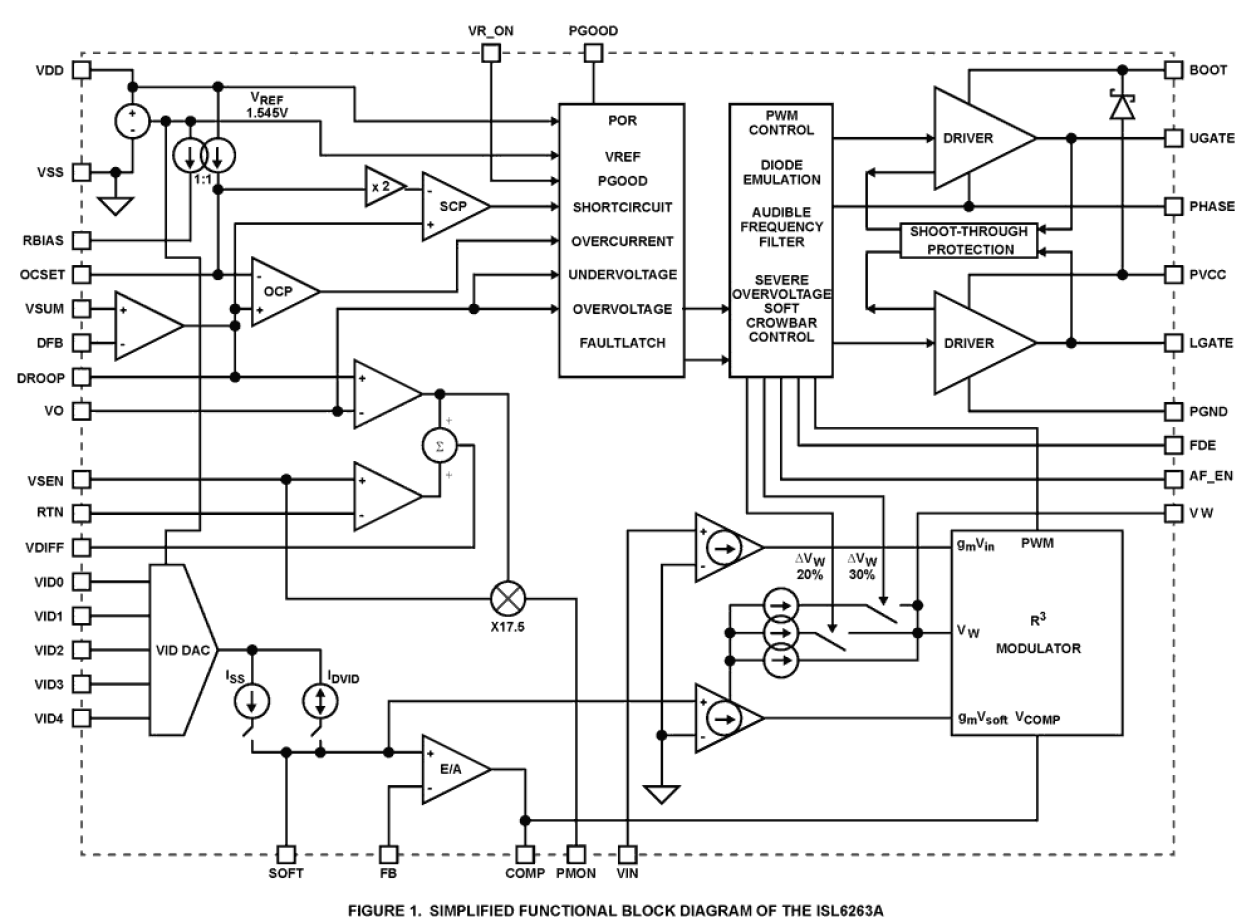 The ISL6263A IC is a Single-Phase Synchronous-Buck PWM voltage regulator featuring Intersil's Robust Ripple Regulator (R3) Technology™. The ISL6263A is an implementation of the Intel® Mobile Voltage Positioning (IMVP) protocol for GPU Render Engine core power. Integrated power monitor, droop amplifier, MOSFET drivers, and bootstrap diode result in smaller implementation area and lower component cost. Intersil's R3 Technology™ combines the best features of both fixed-frequency PWM and hysteretic PWM, delivering excellent light-load efficiency and superior load transient response by commanding variable switching frequency during the transitory event. For maximum conversion efficiency, the ISL6263A automatically enters diode emulation mode (DEM) should the inductor current attempt to flow negative. DEM is highly configurable and easy to setup. A PWM filter can be enabled that prevents the switching frequency from entering the audible spectrum as a result of extremely light load while in DEM. The Render core voltage can be dynamically programmed from 0.41200V to 1.28750V by the five VID input pins without requiring sequential stepping of the VID states. The ISL6263A requires only one capacitor for both the soft-start slew-rate and the dynamic VID slew-rate by internally connecting the SOFT pin to the appropriate current source. Processor socket Kelvin sensing is accomplished with an integrated unity-gain true differential amplifier.