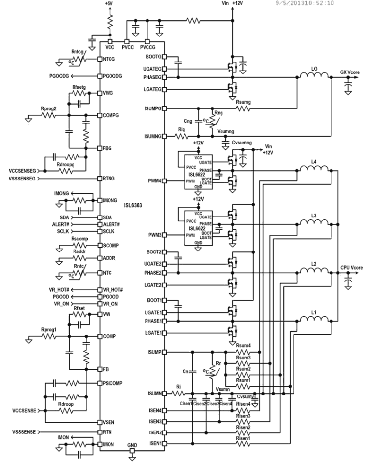 Fully compliant with VR12™ specifications, the ISL6363 provides a complete solution for microprocessor core and graphics power supplies. It provides two Voltage Regulators (VRs) with three integrated gate drivers. The first output (VR1) can be configured as a 4, 3, 2 or 1-phase VR while the second output (VR2) is a 1-phase VR. The two VRs share a serial control bus to communicate with the CPU and achieve lower cost and smaller board area compared with a two-chip approach. Based on Renesas' Robust Ripple Regulator R3 Technology™, the PWM modulator, compared to traditional modulators, has faster transient settling time, variable switching frequency during load transients and has improved light load efficiency with its ability to automatically change switching frequency. The ISL6363 has several other key features. Both outputs support DCR current sensing with a single NTC thermistor for DCR temperature compensation or accurate resistor current sensing. Both outputs come with remote voltage sensing, programmable VBOOT voltage, serial bus address, IMAX, TMAX, adjustable switching frequency, OC protection and separate power-good indicators. To reduce output capacitors, the ISL6363 also has an additional compensation function for PS1/2 mode and high frequency load transient compensation.