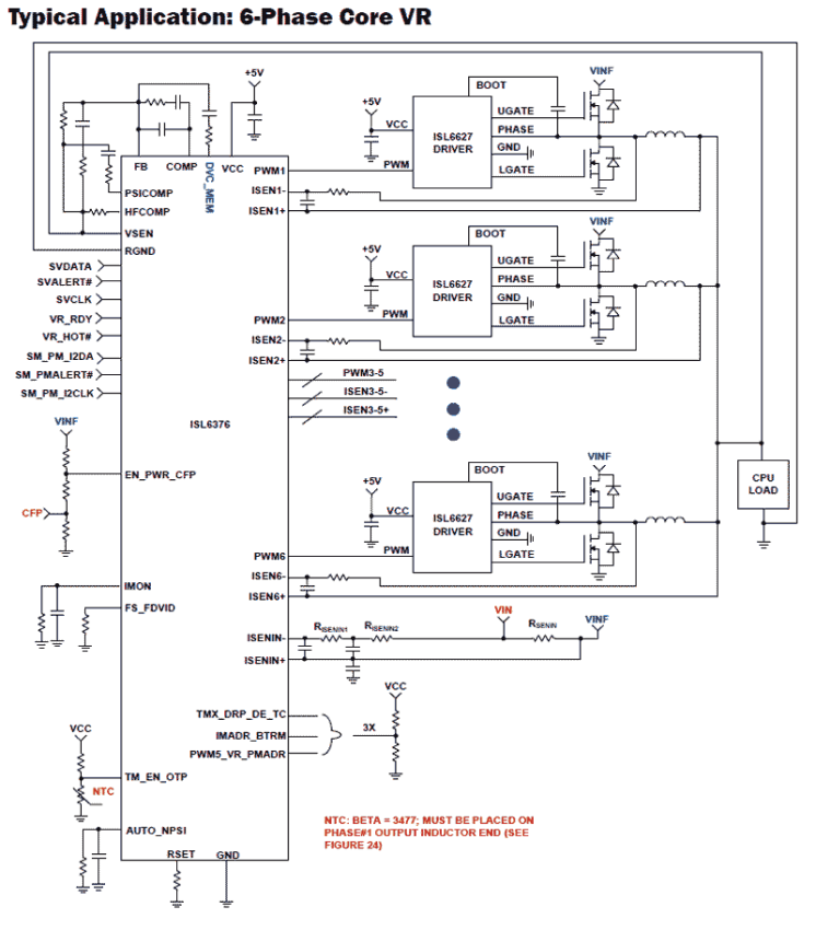 The ISL6376 is an EAPP Hybrid Digital 6-Phase PWM controller and is designed to be compliant to Intel VR12. 5/VR12 specifications and control the microprocessor core or memory voltage regulator. It includes programmable functions and telemetries for easy use, high system flexibility and overclocking applications using SMBus, PMBus, or I2C interface, which is designed to be conflict free with CPU’s SVID bus. This hybrid digital approach eliminates the need of NVM and Firmware often seen in a full digital solution and significantly reduces design complexity, inventory and manufacturing costs. The ISL6376 utilizes Intersil's proprietary Enhanced Active Pulse Positioning (EAPP) modulation scheme to achieve the extremely fast transient response with fewer output capacitors. The ISL6376 accurately monitors the load current via the IMON pin and reports this information via the IOUT register to the microprocessor, which sends a PSI# signal to the controller at low power mode via SVID bus. The controller enters 1- or 2-phase operation in low power mode (PSI1); in the ultra-low power mode (PSI2, PSI3), it operates in single phase with diode emulation option. In low power modes, the magnetic core and switching losses are significantly reduced, yielding high efficiency at light load. After the PSI# signal is de-asserted, the dropped phase(s) are added back to sustain heavy load transient response and efficiency. In addition, the ISL6376 features auto-phase shedding to optimize the efficiency from light to full load for Green Environment without sacrificing the transient performance. Today’s microprocessors require a tightly regulated output voltage position versus load current (droop). The ISL6376 senses the output current continuously by measuring the voltage across a dedicated current sense resistor or the DCR of the output inductor. The sensed current flows out of the FB pin to develop the precision voltage drop across the feedback resistor for droop control. Current sensing circuits also provide the needed signals for channel-current balancing, average overcurrent protection and individual phase current limiting. The TM pin senses an NTC thermistor’s temperature, which is internally digitized for thermal monitoring and for integrated thermal compensation of the current sense elements of the regulator. The ISL6376 features remote voltage sensing and completely eliminates any potential difference between remote and local grounds. This improves regulation and protection accuracy. The threshold-sensitive enable input is available to accurately coordinate the start-up of the ISL6376 with other voltage rails.