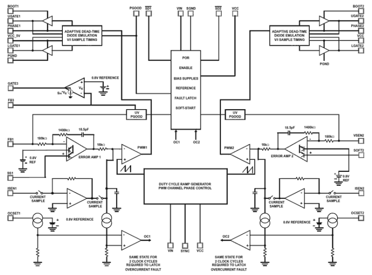 The ISL6443 is a high-performance, triple-output controller optimized for converting wall adapter, battery or network intermediate bus DC input supplies into the system supply voltages required for a wide variety of applications. Each output is adjustable down to 0.8V. The two PWMs are synchronized 180° out of phase reducing the RMS input current and ripple voltage. The ISL6443 incorporates several protection features. An adjustable overcurrent protection circuit monitors the output current by sensing the voltage drop across the lower MOSFET. Hiccup mode overcurrent operation protects the DC/DC components from damage during output overload/short circuit conditions. Each PWM has an independent logic-level shutdown input (SD1 and SD2). A single PGOOD signal is issued when soft-start is complete on both PWM controllers and their outputs are within 10% of the set point and the linear regulator output is greater than 75% of its setpoint. Thermal shutdown circuitry turns off the device if the junction temperature exceeds +150°C.