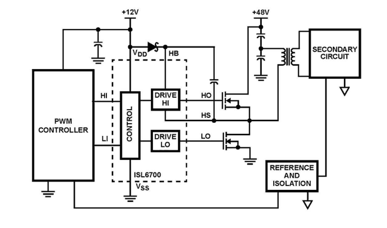 The ISL6700 is an 80V/1.25A peak, medium frequency, low cost, half-bridge driver IC available in 8-lead SOIC and 12-lead QFN plastic packages. The low-side and high-side gate drivers are independently controlled and matched to 25ns. This gives the user maximum flexibility in dead-time selection and driver protocol. Undervoltage protection on both the low-side and high-side supplies force the outputs low. Non-latching, level-shift translation is used to control the upper drive circuit. Unlike some competitors, the high-side output returns to its correct state after a momentary undervoltage of the high-side supply.