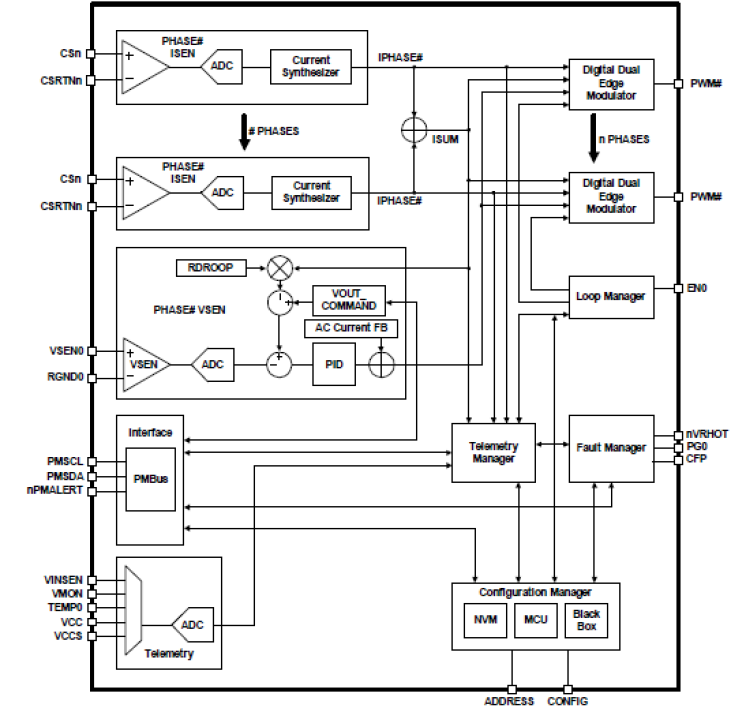 The ISL68227 is a digital multiphase (X ≤ 12) PWM controller with PMBus V1.3 compatibility. The digital multiphase controller can be configured to support any phase assignment up to a maximum of 12 phases. Increased power density, combined with support for PMBus V1.3 allows the ISL68227 to support any demanding power supply requirements.